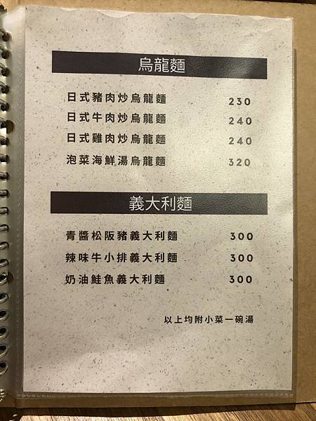 菜單大致分為烏龍麵、義大利麵、米食,以及單點小物